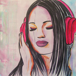 2016Schilderij voor de tienerkamer van een vrolijke meid met een roze koptelefoon. Het schilderij is handgeschilderd met acrylverf en bewerkt met graffiti.