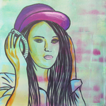 2016Schilderij voor de tienerkamer van een stoere meid met paarse pet en koptelefoon. Het schilderij is handgeschilderd met acrylverf en bewerkt met graffiti.