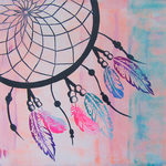 2016Stoer schilderij voor op de tienerkamer van een dromenvanger. Het schilderij is handgeschilderd met acrylverf en bewerkt met graffiti.