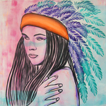 2016Stoer schilderij voor op de tienerkamer van een Indiaan met Veren. Het schilderij is handgeschilderd met acrylverf en bewerkt met graffiti.
