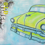 2016Stoer auto schilderij voor de jongenskamer van een gele oldtimer. Het schilderij is handgeschilderd met acrylverf en bewerkt met graffiti.