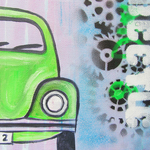 2016Stoer auto schilderij voor de jongenskamer van een groene Kever. Het schilderij is handgeschilderd met acrylverf en bewerkt met graffiti.
